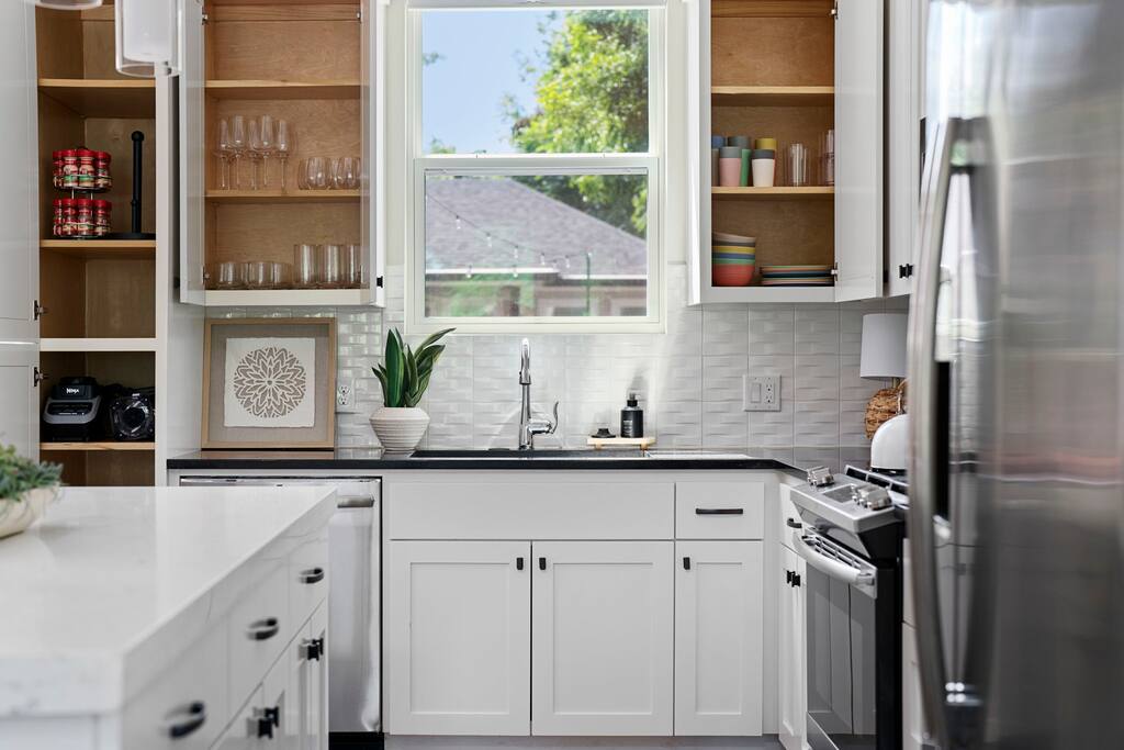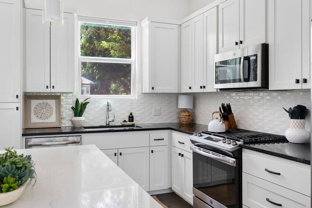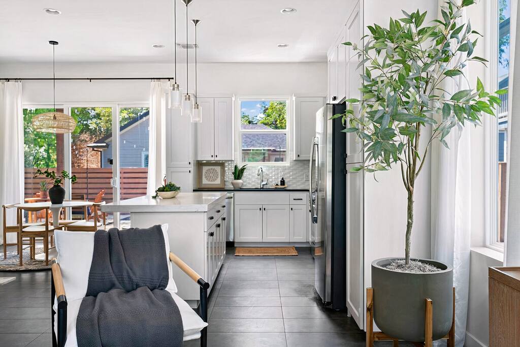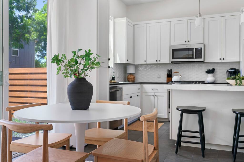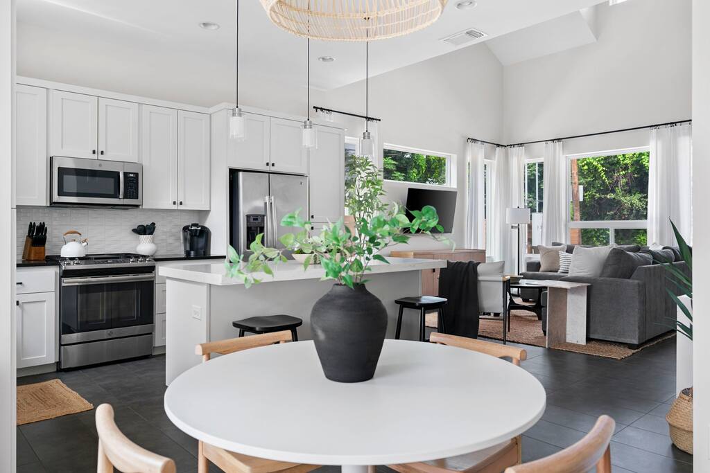 The kitchen is shared with the elegant dining area which receives plenty of natural light from the large windows. Enjoy stunning views while eating a delicious meal with friends and family.