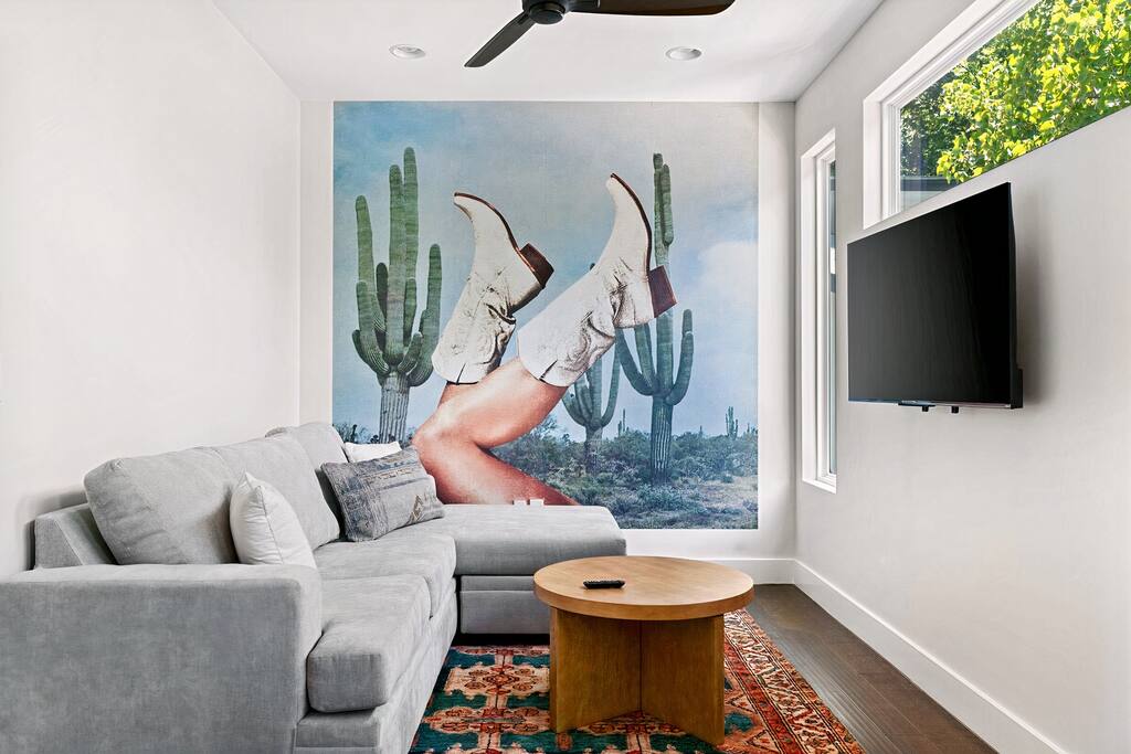 The cabin boasts its own movie theater and game room, complete with foosball, arcade games, and even a putt-putt course. Whether you’re unwinding in the sauna or challenging friends in the game room, there’s fun for everyone. Younger children will love the indoor playhouse.