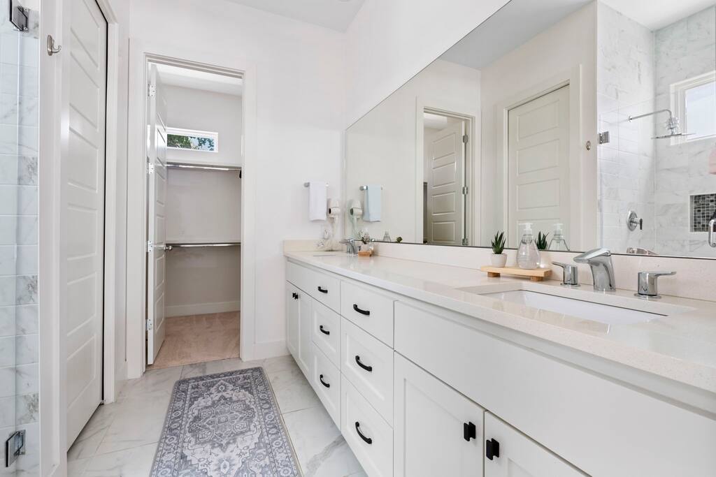 * You’ll find the primary bedroom with a plush queen-sized bed. The ensuite bathroom contains a double vanity and both a standing shower and a jacuzzi tub so you can choose between a luxurious soak or a refreshing shower.
