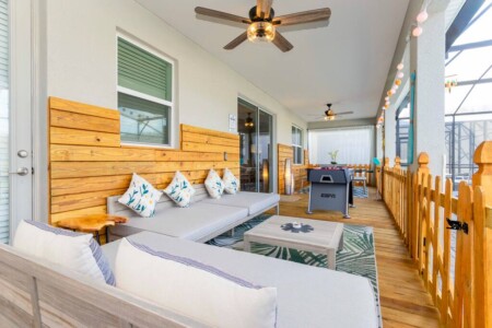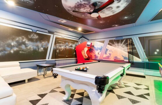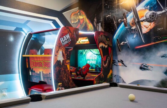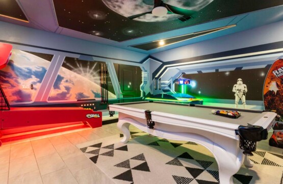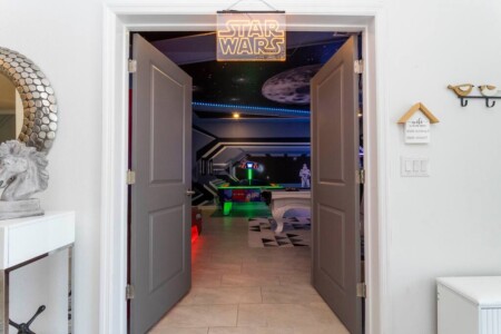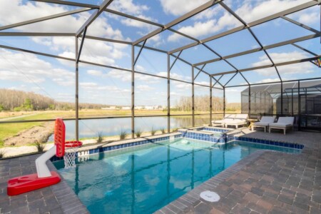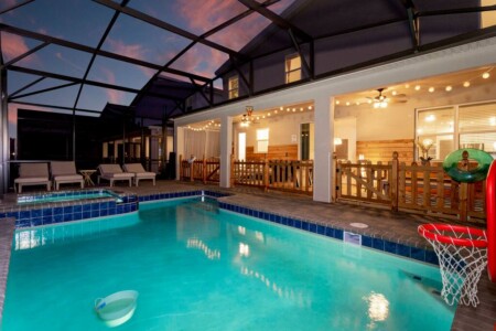 This spacious 9-bdrm lakefront villa sleeps up to 28 guests and is close to Disney parks, shopping, and more! Dine or play some foosball on the large back porch with lakeview, or swim under the sun or stars in the lighted outdoor pool/spa. Now throw in an arcade game room, themed bedrooms, and free access to the Hideaway Club (w/ lazy river, water slides, kayaking, etc) for a trip to remember.
